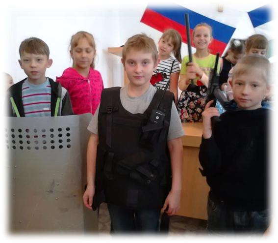 Завершающим этапом экскурсии стала встреча и демонстрация снаряжения. Сотрудники полиции показали современное вооружение, которыми они экипируются и защищают жизнь гражданина, а также разрешили одеть: каску, бронежилет, подержать в руках дубинку и огнестрельное оружие. Дети были очень довольны, ведь на несколько минут они смогли себя почувствовать защитниками правопорядка и сделали вывод, что полицейский должен быть очень терпеливым и выносливым человеком.
